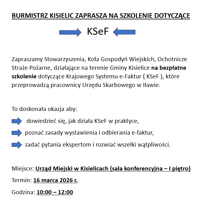 Burmistrz Kisielic zaprasza na szkolenie dotyczące - KSeF Publikacja: 11.03.2026 | Zmiana: 11.03.2026